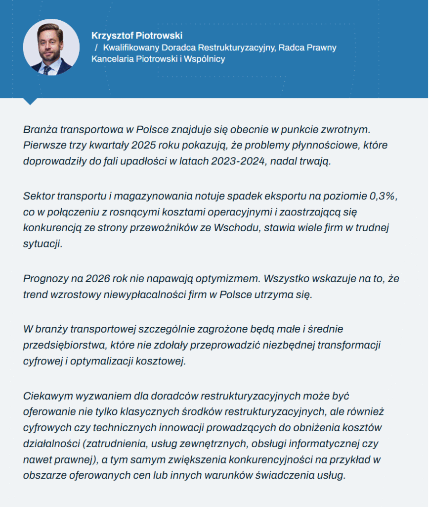 “Dane z raportu MGBI pokazują, że ryzyko bankructwa firmy transportowej wzrosło w ostatnim roku o ponad 15%. Wczesne działania restrukturyzacyjne mogą jednak skutecznie temu zapobiec” – komentuje mecenas Krzysztof Piotrowski.